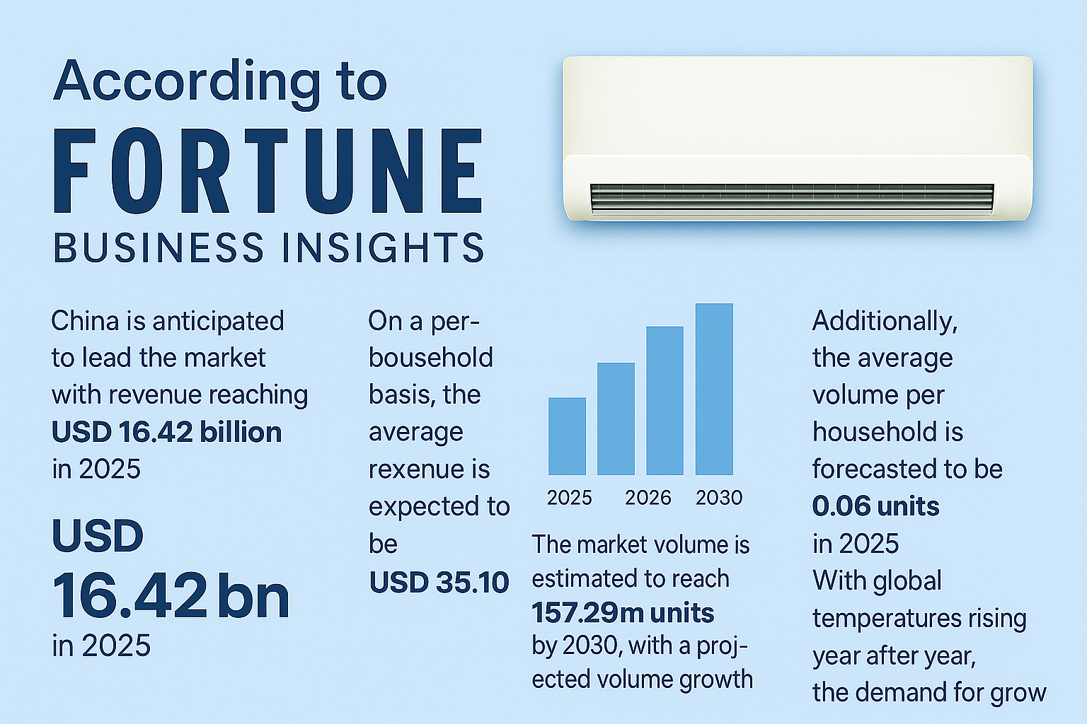 According to Fortune Business Insights, the global air conditioners market is projected to generate revenue of USD 72.36 billion in 2025, with an expected compound annual growth rate (CAGR) of 6.53% from 2025 to 2030. China is anticipated to lead the market with revenue reaching USD 16.42 billion in 2025. On a per-household basis, the average revenue is expected to be USD 35.10. The market volume is estimated to reach 157.29 million units by 2030, with a projected volume growth of 5.08% in 2026. Additionally, the average volume per household is forecasted to be 0.06 units in 2025. With global temperatures rising year after year, the demand for air conditioners continues to grow steadily.