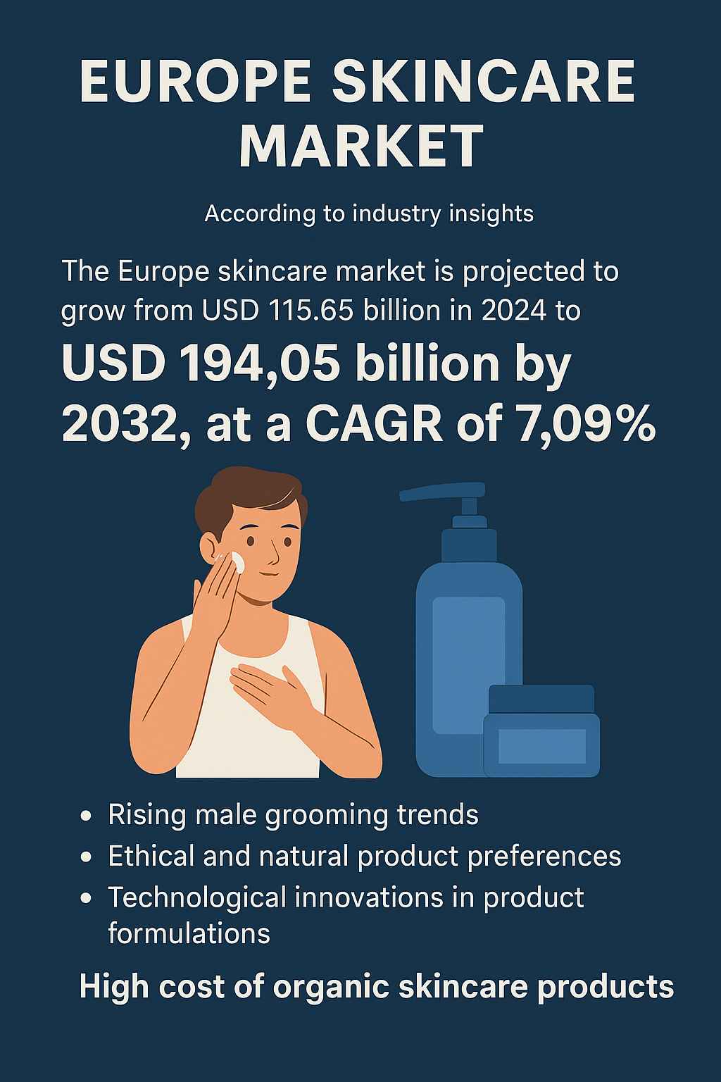 According to Fortune Business Insights, the Europe skincare market is poised for substantial growth, with the global skincare industry projected to increase from USD 115.65 billion in 2024 to USD 194.05 billion by 2032, growing at a CAGR of 7.09% during the forecast period. Europe currently stands as the third-largest region in the global skincare market, showing strong growth potential driven by evolving consumer demands and innovative product launches.