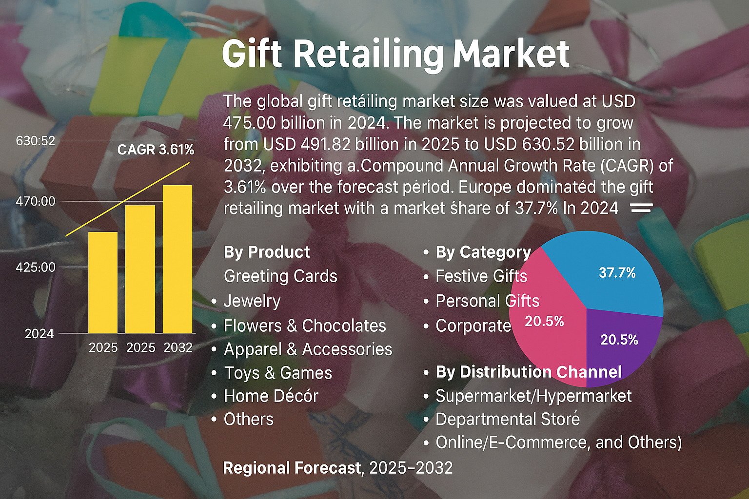 According to Fortune Business Insights, the global gift retailing market was valued at USD 475.00 billion in 2024 and is projected to rise to USD 630.52 billion by 2032, growing at a CAGR of 3.61% during the forecast period. Europe led the market with a 37.7% share in 2024, followed by North America and Asia Pacific. The market comprises a diverse range of gift products including greeting cards, jewelry, apparel, accessories, and more.