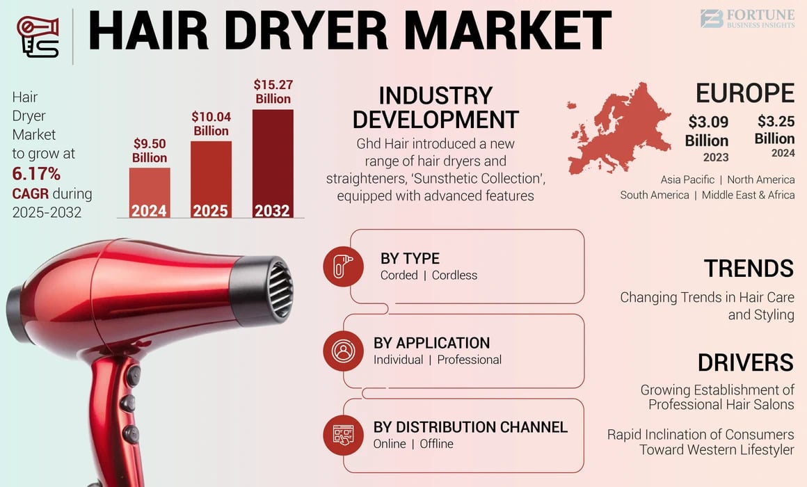 According to Fortune Business Insights, global hair dryer market was valued at USD 9.50 billion in 2024. The market is projected to be worth USD 10.04 billion in 2025 and reach USD 15.27 billion by 2032, exhibiting a CAGR of 6.17% during the forecast period. Europe dominated the hair dryer market with a market share of 34.21% in 2024.