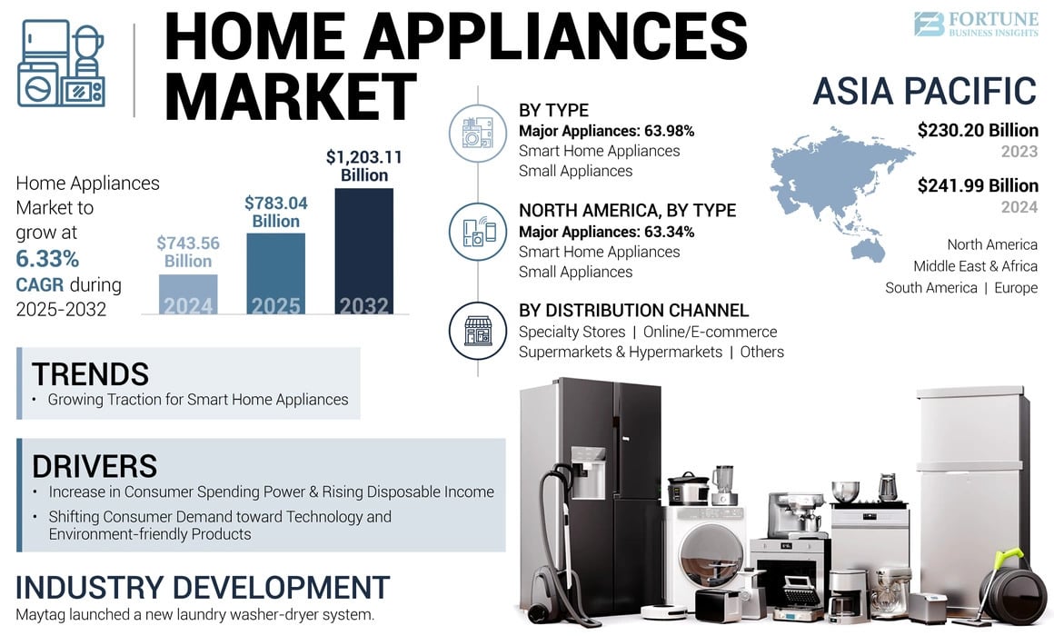 According to Fortune Business Insights, global home appliances market was valued at USD 743.56 billion in 2024 and is projected to grow from USD 783.04 billion in 2025 to USD 1,203.11 billion by 2032, registering a CAGR of 6.33% during the forecast period. This steady growth is driven by rising disposable incomes, increasing urbanization, smart home adoption, and the rising demand for energy-efficient and multifunctional appliances.