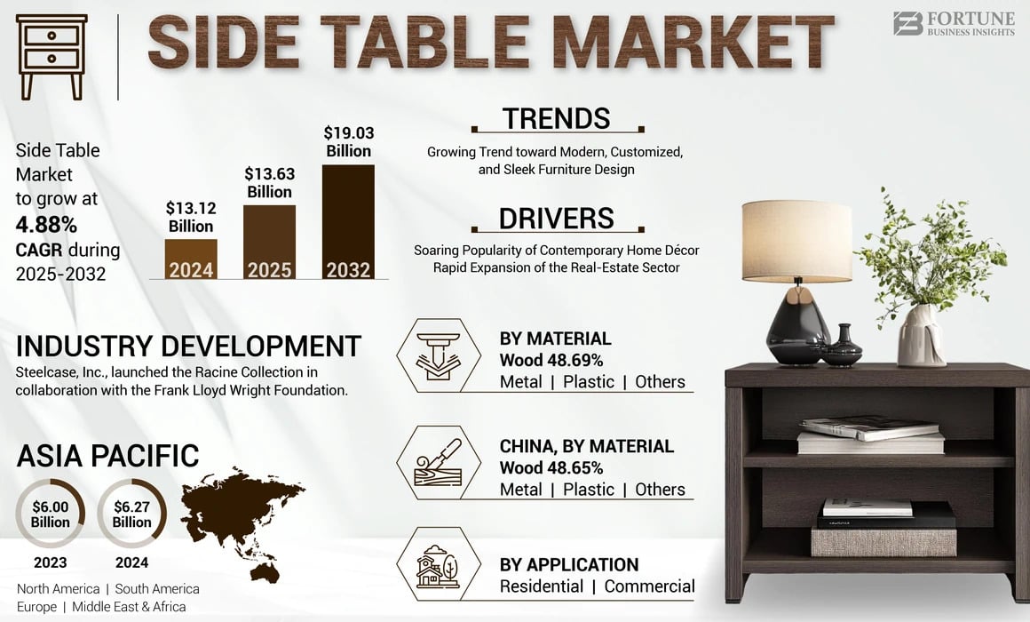 According to Fortune Business Insights, the global side table market was valued at USD 13.12 billion in 2024 and is projected to reach USD 19.03 billion by 2032, growing at a CAGR of 4.88% during the forecast period. The increasing demand for functional, stylish, and space-saving furniture is significantly driving market growth. Asia Pacific dominated the global market in 2024, holding a 47.79% market share, while the U.S. side table market is expected to reach USD 3.51 billion by 2032, driven by the rising preference for high-quality home furnishings.