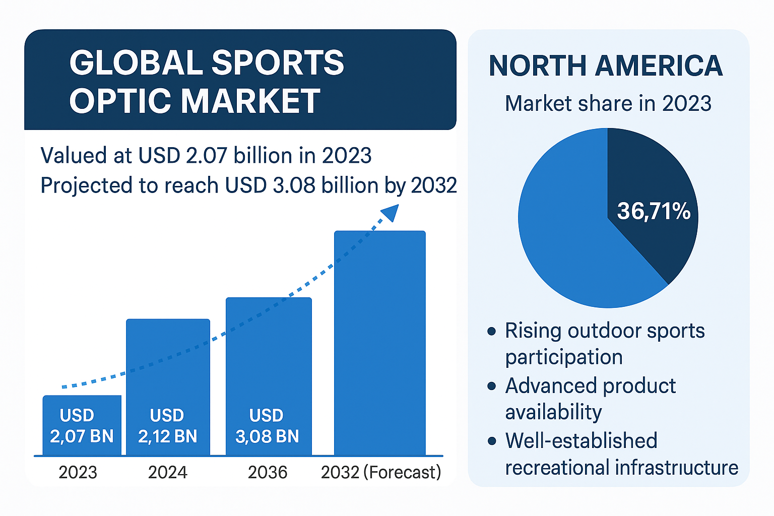 According to Fortune Business Insights, the global sports optic market was valued at USD 2.07 billion in 2023, is projected to reach USD 2.12 billion in 2024, and is expected to grow to USD 3.08 billion by 2032, registering a CAGR of 4.77% during the forecast period (2024–2032).